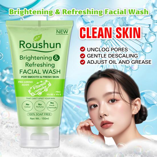 Roushun Brightening & Refreshing Facial Wash: A 100% soap-free cleanser with pro amino acids and vitamin B complex. It deeply removes oil, unclogs pores (reduces blackheads/acne), controls oil, and removes mites—while being mild (no added color/perfume/chemicals). Leaves skin moisturized (not tight) after washing, ideal for oily/troubled skin.