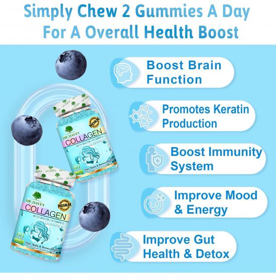 These vegan collagen gummies from DR.DAVEY deliver 1000mg of hydrolyzed collagen (plus biotin, Vitamin E, and selenium) per 2-gummy serving. Formulated to support overall wellness, they target beauty and health benefits: promoting youthful/radiant skin, stronger nails, thicker hair, and supporting bones/joints. Additional benefits include boosting brain function, immunity, mood/energy, and gut health. Each bottle contains 60 gummies, designed as a convenient daily supplement for internal and external wellness.