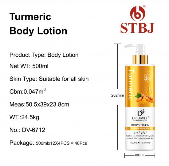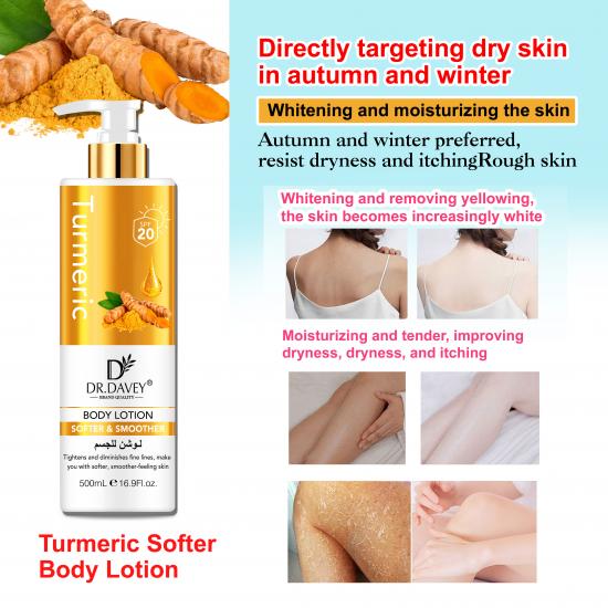 This DR.DAVEY body lotion (500mL) features turmeric as its core ingredient, designed to solve dryness, roughness, and yellowing. It delivers deep hydration (locking in moisture), repairs dry/itchy skin (ideal for autumn/winter), and brightens skin tone—while tightening and minimizing fine lines for a softer, smoother texture. The formula also includes SPF 20 for sun protection, and can be used post-bath or as emergency moisturizer for full-body nourishment.