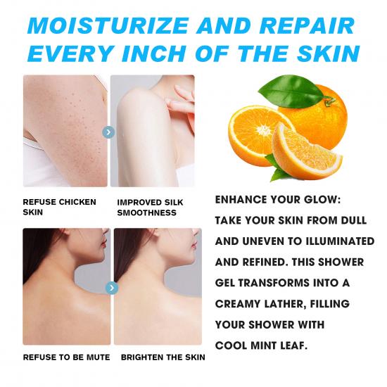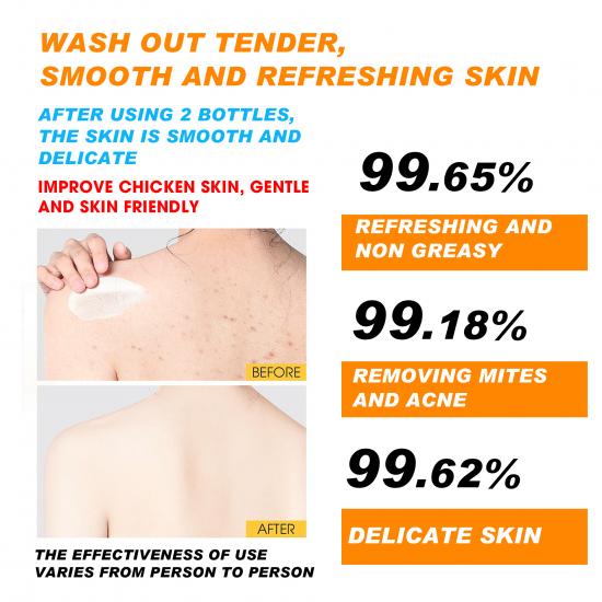 This shower gel delivers tender, smooth and refreshing skin—after 2 bottles, it visibly improves chicken skin for a delicate texture. It’s gentle and skin-friendly, with 99.65% refreshing non-greasy performance, 99.18% mite & acne removing effect, and 99.62% delicate skin results. It moisturizes and repairs every inch of skin: banishes chicken skin, boosts silk-like smoothness, brightens dull areas, and transforms into creamy lather with a cool mint scent, leaving skin illuminated and refined. Note: Effectiveness varies by individual.
