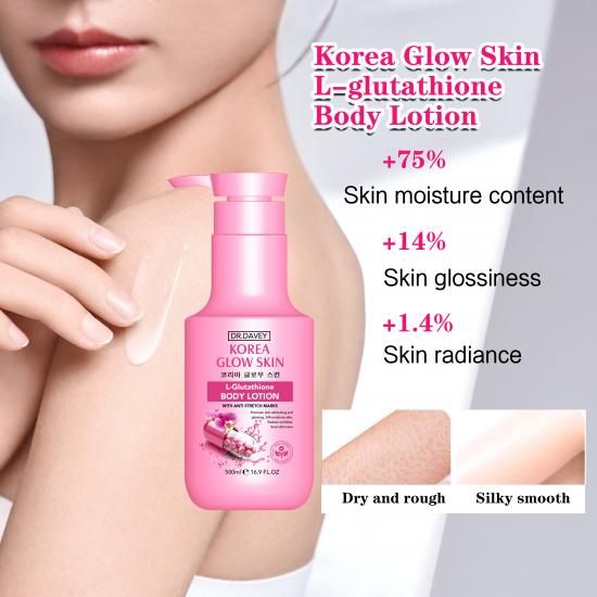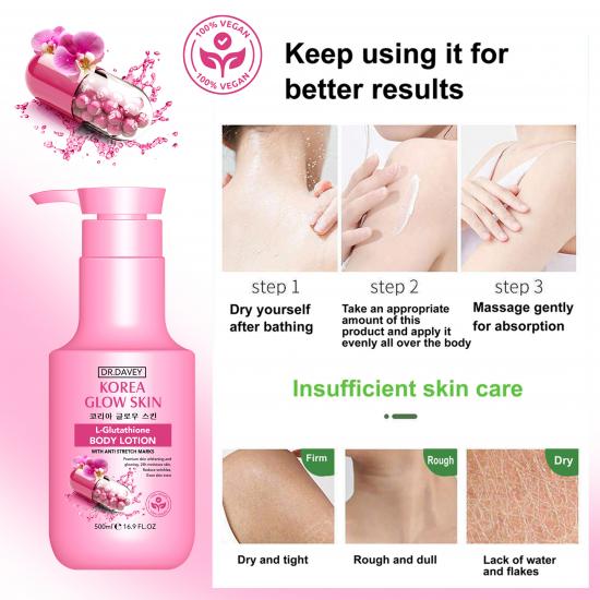 DR.DAVEY’s L-Glutathione Body Lotion (100% vegan) is a Korea Glow Skin formula targeting dry, dull skin. It delivers instant hydration (up 91.50%) and moisturization (up 85.60%), while boosting skin fairness (86.50%) and glossiness (14%). It also helps reduce stretch marks, transforming rough, tight skin into silky-smooth, radiant skin with consistent use.