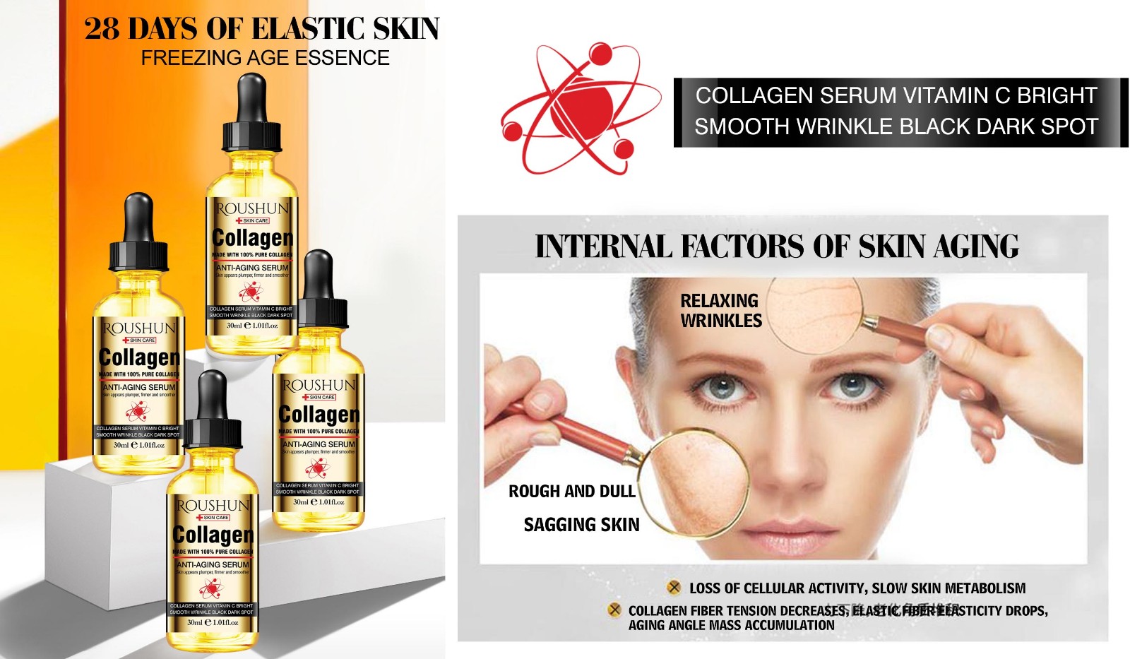 ROUSHUN private label serum collagen serum for Face Increases skin resistance, leaving skin with a natural glow Say goodbye to the dark spots Dry and loose skin try our vitamin c faical serum.Perfection for private label OEM /ODM since 1993 Ready stock start from 192pcs can be sale private label only 3000pcs contact with us get the best price