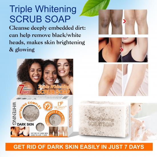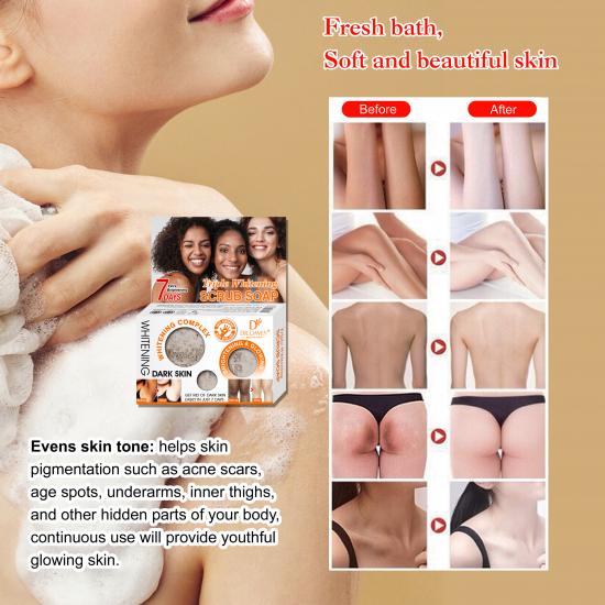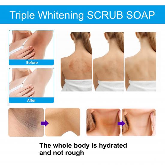 This scrub soap offers "triple whitening" effects, claiming to reduce dark skin (e.g., underarms, inner thighs) in 7 days. It deeply cleanses embedded dirt/blackheads, fades pigmentation (acne scars, age spots), and evens skin tone. The formula leaves the whole body hydrated (not rough) while brightening, aiming to deliver youthful, glowing skin with continuous use.