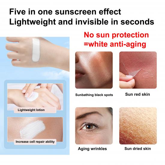 This sunscreen offers high-level SPF 90+ & PA+++++ protection against daily UV rays, preventing issues like sun spots, redness, aging wrinkles, and dryness. It features a 5-in-1 multifunctional formula with a lightweight, fast-absorbing lotion texture (invisible on skin) and boosts cell repair ability. The water/sweat-resistant design makes it suitable for year-round (365-day) use, balancing strong sun protection with comfortable, non-heavy wear.